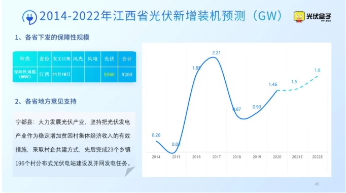 2022年1月17日,光伏盒子主编诸葛的直播课程《2021年江西户用光伏回顾》为我们带来了2021年江西户用光伏的发展进行了回顾与展望,可以预见的是,双控限电下的江西光伏,发展势头强劲。江西市场今年保持3倍速增长,明年可以达到GW甚至2GW以上规模。传统成熟市场继续成长,新兴市场容量与潜力也不容小觑。