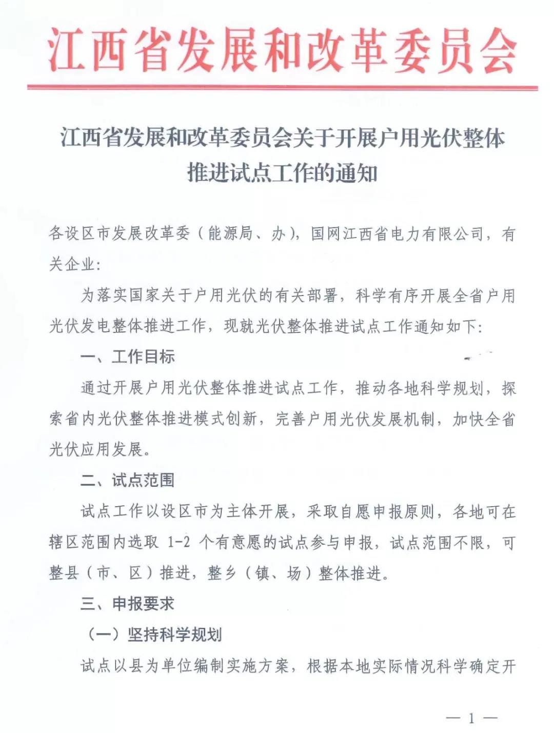 6月11日,江西省发改委下发《关于开展户用光伏整体推进试点工作的通知》,提出:鼓励县企合作,按照自愿的原则,开展户用光伏整县、整镇推进的工作。