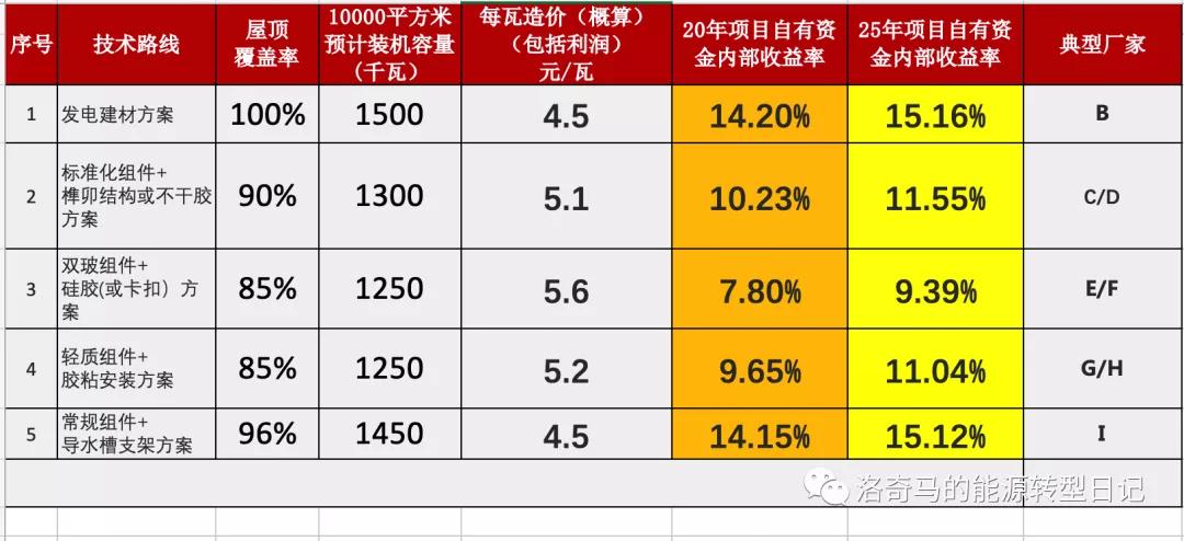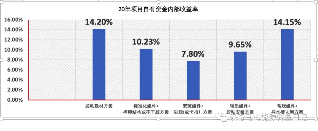 按此模型测算结果如下所示,可以看出各种技术路线的收益率差距非常大,而常规组件和和导水槽的方案虽然收益率高些,但是存在防火和防水的风险。发电建材方案的优势还是十分明显的。