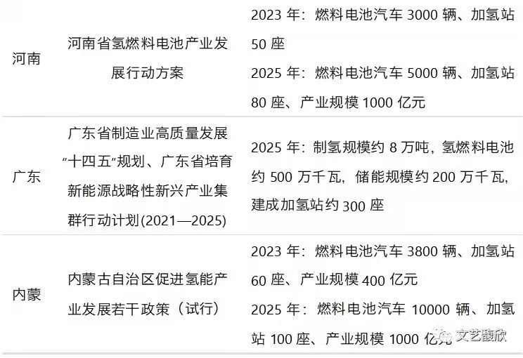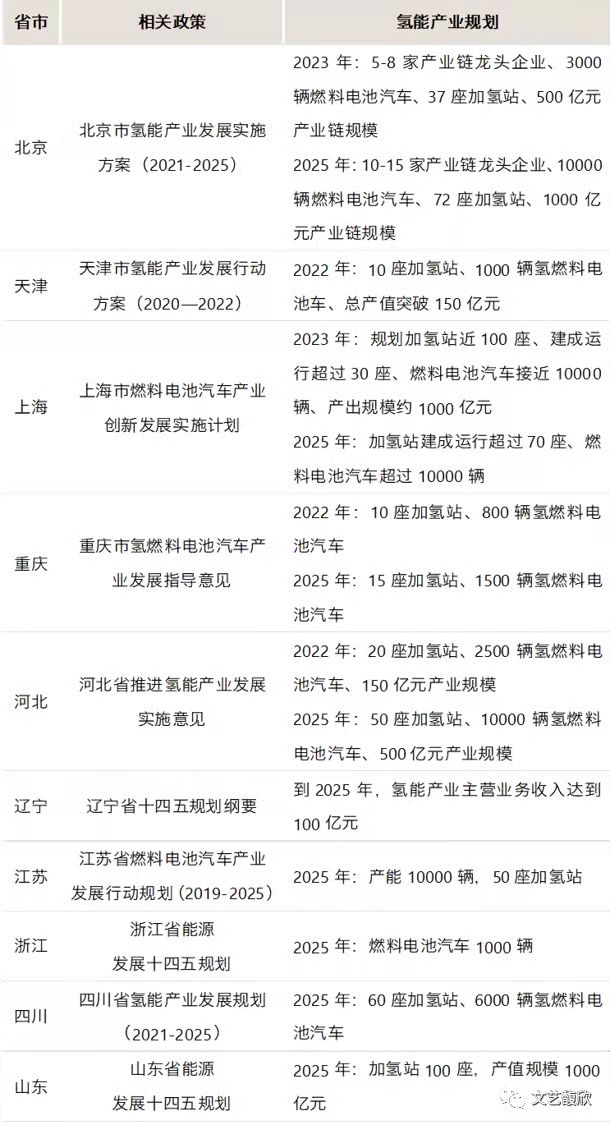 除国家层面的政策外,2021年,各省市出台的地方政策达数百项。根据中国人民大学发布的《氢能城市发展潜力排行榜》,我国已有30个省份、158个城市在其“十四五”规划中提及氢能发展,有57个城市出台了地方氢能产业发展专项规划,根据各省规划目标,到2025年全国将建成加氢站1002座,推广氢燃料车5.5万辆。部分省市氢能产业规划如下: