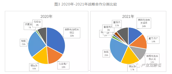 从2020年和2021年的合作项目的内容来看,2020年战略合作最多的是燃料电池相关技术,共23项,占所有项目的32.86%;制氢项目共18项,占全部项目的25.71%;氢车推广和储运加项目各11项,占总体项目的15.71%;氢能综合项目6项;氢能装备项目1项。
