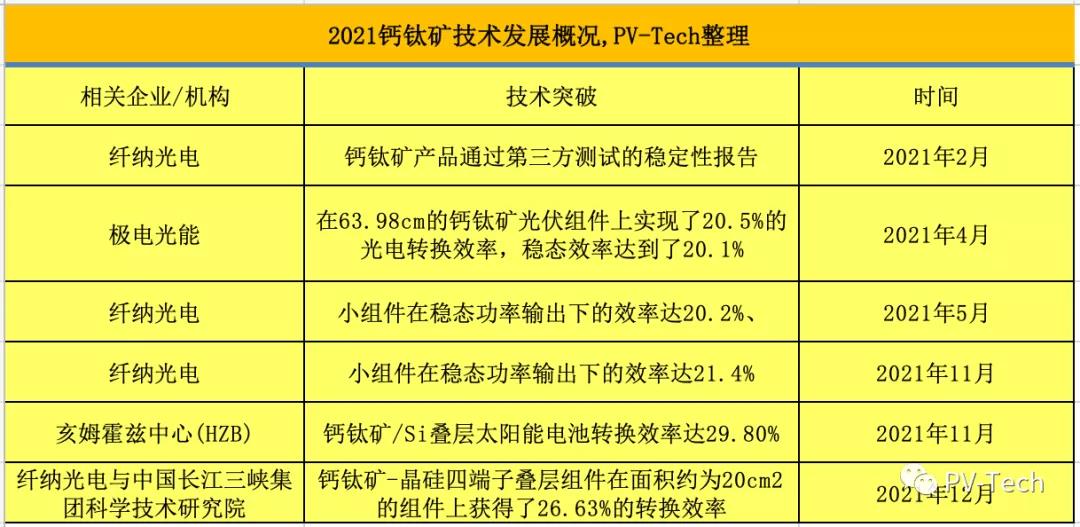 2021年各企业及研究机构钙钛矿技术突破汇总,PV-Tech整理