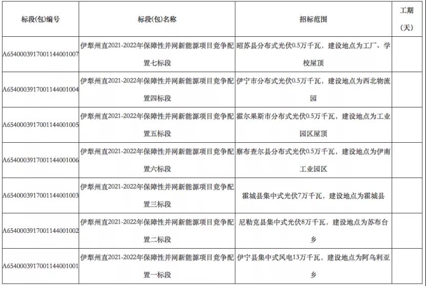 1月25日,伊犁州直启动2021-2022年保障性并网新能源项目竞争配置,本次招标新增保障性并网新能源项目规模(含激励规模)为300MW,其中光伏170MW,风电130MW,共划分七个标段。