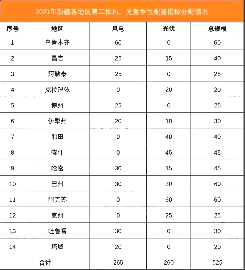 据光伏們获悉, 新疆第二批竞争性配置指标风、光合计规模为5.25GW,其中风电2.65GW,光伏2.6GW。昌吉州400MW、伊犁州直300MW便包含在其中。