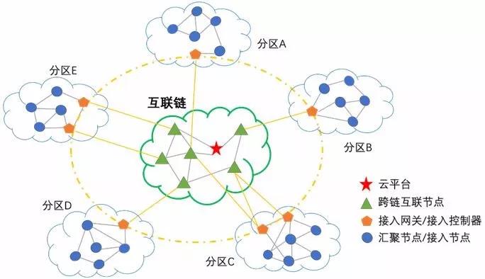 泛在电力物联网一个特性是便于划分片区。小到一个变电站,站内安装的局部放电、气体组分、温湿度、视频、红外等所有传感器,依托于汇聚节点或接入节点构建成一个小的区块链。若干变电站间再通过接入控制器或接入网关构建一个更大范围的区块链。这样就将原始的区块链切分为很多分区,交易记录将在不同分区并行处理。因此,可将图1所示架构改进为图2所示的分区并行联盟链。根据区域或业务对电力设备泛在物联网进行合理分区即并行化处理,再通过跨链互联节点在互联链中与云平台节点进行数据及服务交易。片内交易时的共识机制采用流水化技术优化效率,并通过随机轮换记账节点集合机制进一步提升效率,从而最终构建一个更适用于电力设备泛在物联网的分区并行高通量联盟链。