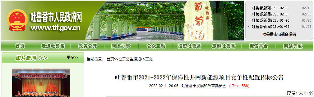 2月11日,吐鲁番市政府发布《吐鲁番市2021-2022年保障性并网新能源项目竞争性配置招标公告》,公告显示: