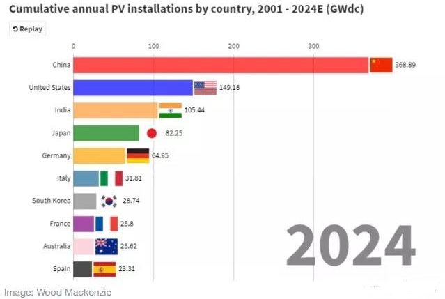 全球知名能源咨询顾问公司伍德麦肯兹估计,到2024年,中国太阳能光伏装机容量累计将达到370吉瓦,是美国的两倍多。随着世界各国继续增加太阳能装机容量,伍德麦肯兹预测,2020年将是太阳能产业大幅增长的最后一年。