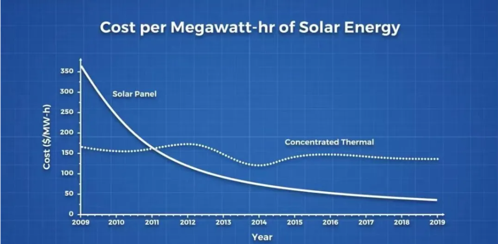 然而,今时不同往日,熔盐储能型太阳能热发电相比光伏发电具有无可比拟的优势,全球变暖日趋严峻,在碳中和愿景下,新能源发电未来要作为电力主体,必须配置储能以消除电网波动性问题。而与光伏发电匹配的蓄电池成本高、安全性差和寿命短等缺点突出,综合考虑,远不如带有熔盐储能的太阳能热发电经济可靠。