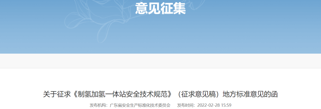 2月28日,广东省安全生产标准化技术委员会印发了关于征求《制氢加氢一体站安全技术规范》(征求意见稿)(以下简称“《意见稿》”)。