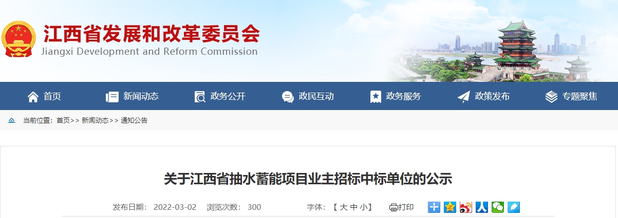 关于江西省抽水蓄能项目业主招标中标单位的公示