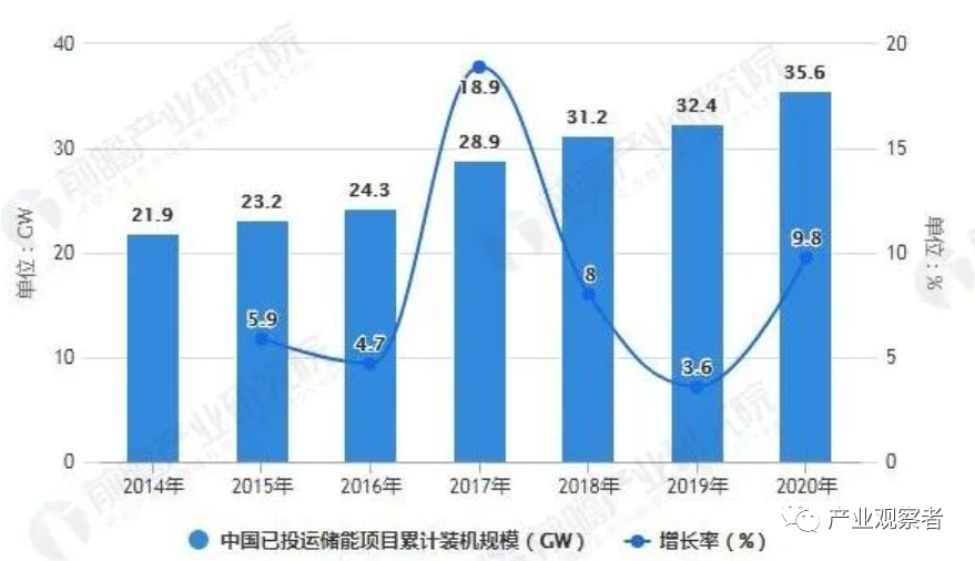 据中关村储能产业技术联盟(CNESA)数据,实际截至2020年底,我国已投运储能项目累计装机规模为35.6GW,占全球已投运储能项目累计装机规模191.1GW的18.6%。