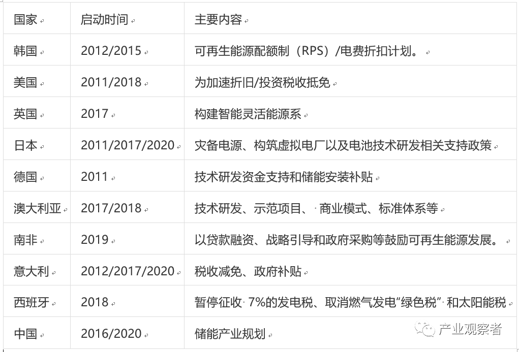 储能产业是在可再生能源发展过程中派生出来的一个产业,世界主要国家目前都是近几年启动的储能鼓励政策,鼓励政策主要是与可再生能源的匹配。从各国储能鼓励政策来看,大部分都是在最近十年内启动的,鼓励的方向主要是与新能源的配额,构建稳定的能源体系,鼓励的方式包括税收减免、政府补贴、政策性贷款以及产业规划等。