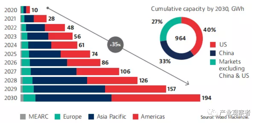 彭博新能源财经预计到2030年全球储能装机容量将达到358GW/1,028GWh,是2020年底17GW/34GWh规模的20倍以上,并将在2021年至2030年间吸引到2,620亿美元的投资。