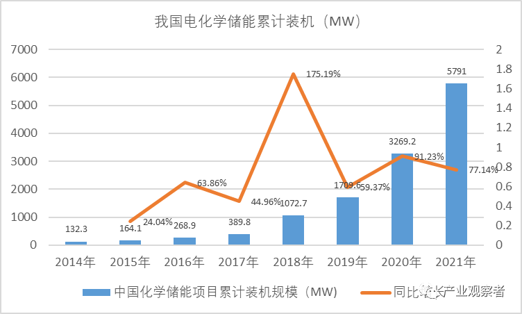 我国电化学储能自2014年的132.3MW到2021年的5791MW,7年增长了近44倍。2020年电化学储能的累计装机规模同比增长49%,远高于蓄水储能的增幅。