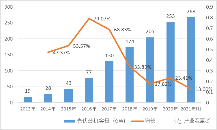 化学储能增长的驱动力来自需求和供给两个方面,从需求端,可再能源特别是分布式光伏的发展为化学储能带来刚需,截至2020年底,全国光伏发电累计装机达到253GW,而且目前光伏发展趋势是在向分布式发展,2021年上半年,全国新增光伏装机约13.01GW,同比增长12.9%,其中集中式光伏电站新增装机5.36GW,同比减少24.3%,分布式光伏新增装机7.65GW,同比增长72.3%。
