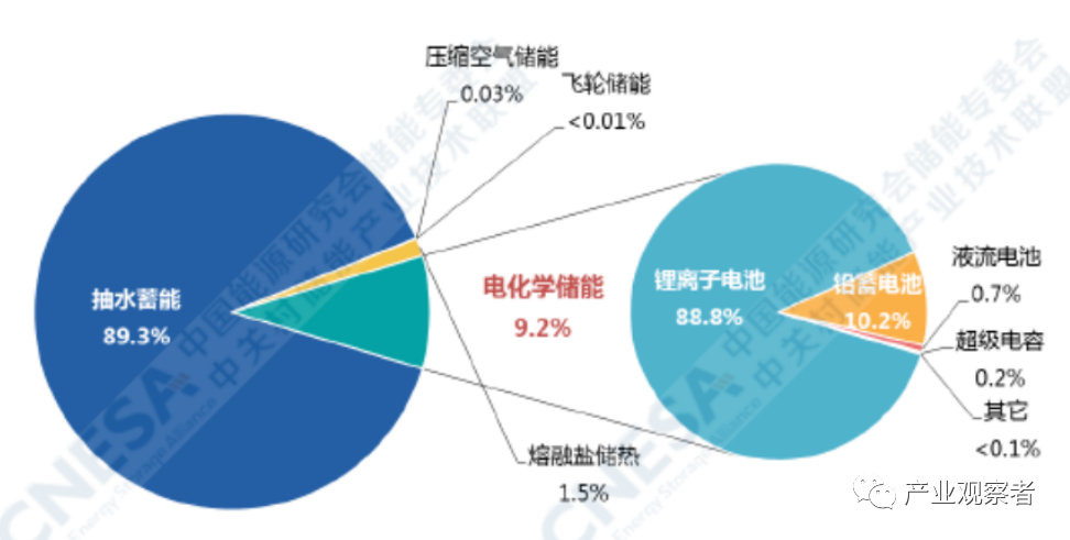 从我国投运储能项目的装机结构来看,抽水储能也是目前最主要的储能方式,占比达89.3%;我国新型储能的结构占比仍较小,新型储能中电化学储能为主要储能方式,而其中以锂离子电池为主,占比达88.8%。