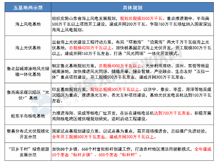 其中,规划海上风电基地总规模35GW以上、海上光伏基地42GW以上、鲁北盐碱滩涂地风光储输一体化基地40GW以上、鲁西南采煤沉陷区“光伏+”基地5GW以上、胶东半岛核电基地达到7GW左右,全年开工5GW、建成并网3GW以上整县光伏示范试点,全年建成50个左右“标杆乡镇”、500个左右“标杆村”。