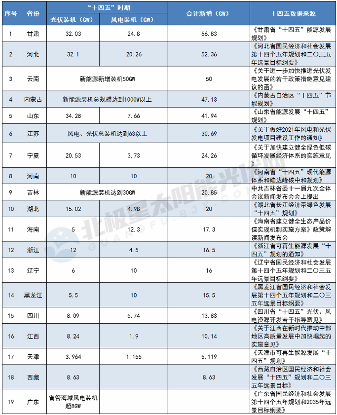 据北极星太阳能光伏网统计,截至目前,已有甘肃、河北、云南、内蒙古、山东、江苏、宁夏、海南、吉林、湖北、湖南、浙江、辽宁、黑龙江、四川、江西、天津、西藏、广东19个省市自治区敲定“十四五”时期光伏、风电装机规模,规划新增总规模已超过467GW。