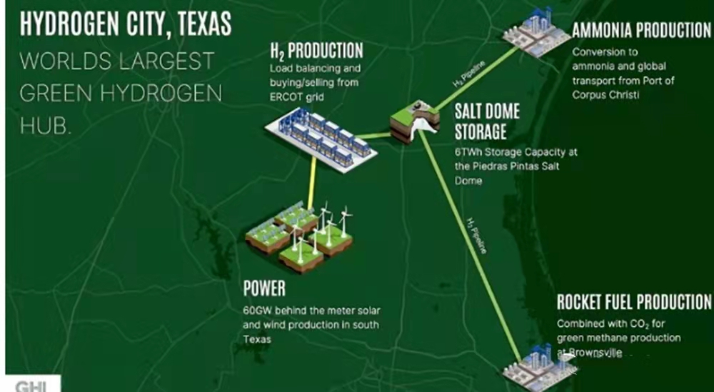 美国的一家初创企业GHI(Green Hydrogen International)将在得克萨斯州建造全球最大的绿氢项目,计划以60GW的太阳能和风电、盐穴储能系统制造氢气。