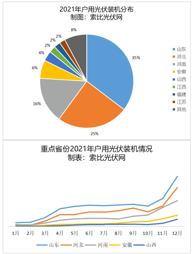 从2021年各省户用光伏装机规模看,山东、河北、河南依然是最核心的三个主力市场,安徽、山西、江西、福建、江苏等5个省也实现了装机超400MW、占比超2%的目标。