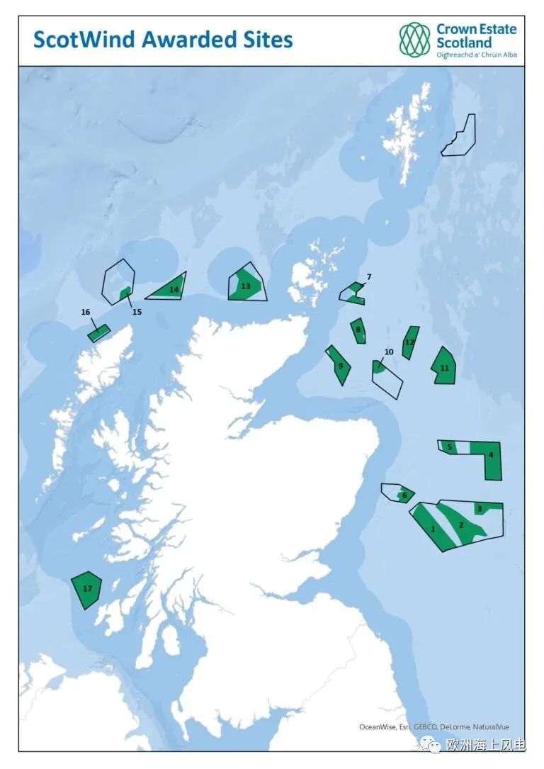 今年1月,苏格兰皇家资产管理局公布了全球有史以来最大的海上风电使用海域租赁权(相当于拥有海上风电开发权)竞标结果,总计17个风场,预计装机规模可达25GW。