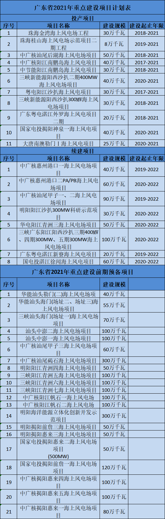 注:2021年,广东共规划建设40个海上风电项目,其中包括19个重点建设项目和21个重点建设前期预备项目。19个重点建设项目中有11个计划在2021年投产。