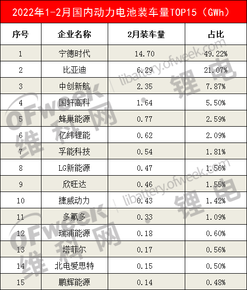 你追我赶!2月国内动力电池装车量TOP15出炉!