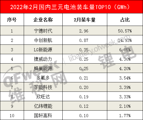 2月国内三元电池装车量TOP10的企业分别是:宁德时代、中创新航、LG新能源、捷威动力、蜂巢能源、多氟多、孚能科技、欣旺达、亿纬锂能、国轩高科。