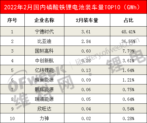 2月国内磷酸铁锂电池装车量TOP10的企业分别是:宁德时代、比亚迪、国轩高科、中创新航、亿纬锂能、蜂巢能源、鹏辉能源、瑞浦能源、欣旺达、力神。