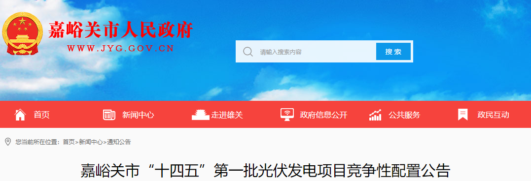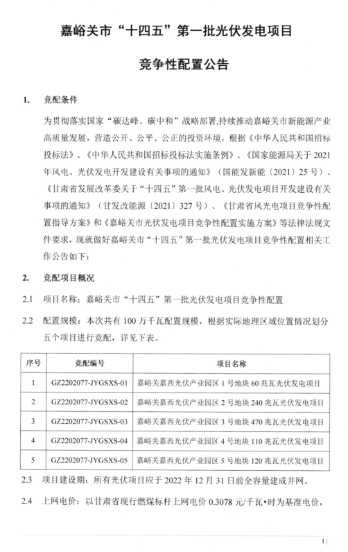 日前,嘉峪关发布了“十四五”第一批光伏发电项目竞争性配置公告。公告显示,此次共有100万千瓦配置规模。