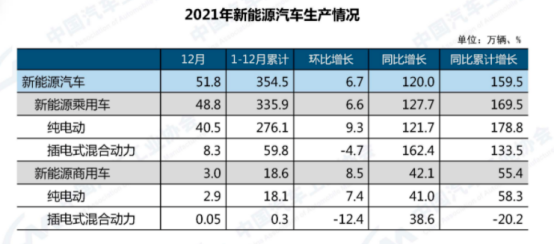 据中汽协数据,2021年汽车产销同比呈现增长,结束了2018年以来连续三年的下降局面。其中新能源汽车全年销量超过350万辆,市场占有率提升至13.4%。新能源乘用车销量超过335万辆,其中纯电动车276万辆,同比增长121.7%,插电式混合动力车59.8万辆,同比增长162.4%。