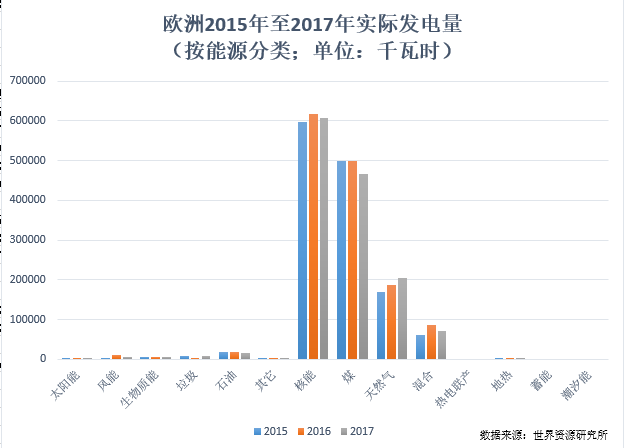 而从2015年到2017年的实际发电量来看,新能源的贡献也十分有限。供电最多的能源依旧为核能、煤和天然气。