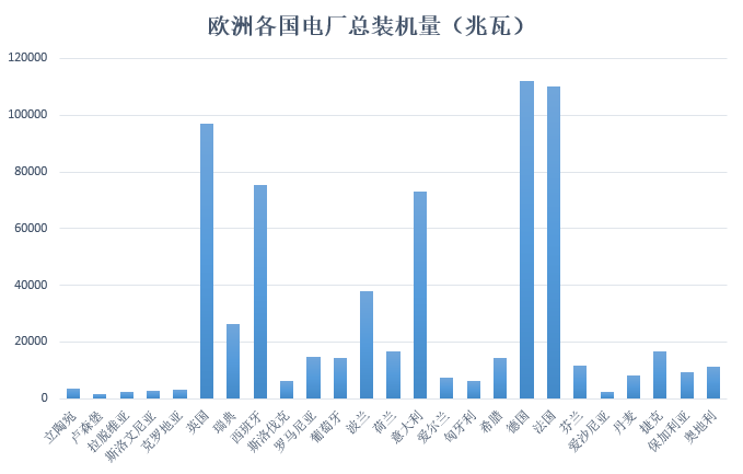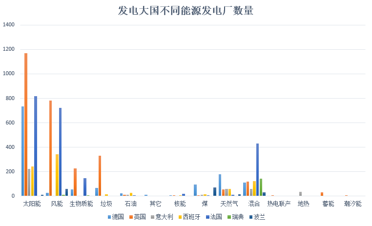 根据数据显示,欧洲国家中发电主要集中在英国、西班牙、瑞典、波兰、意大利、德国和法国这几个大国。