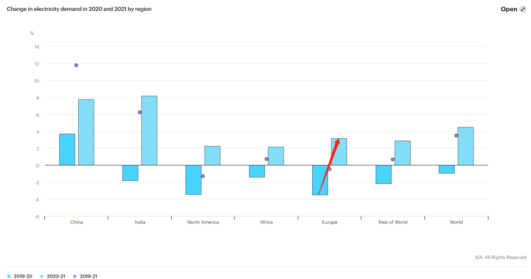 国际能源署对近年碳排放的追踪也表明,欧洲国家在疫情开始以后,碳排放量重新抬头,2021年的碳排放量增长达到了7%。与之对应的是,欧洲对电力的需求正在增长。