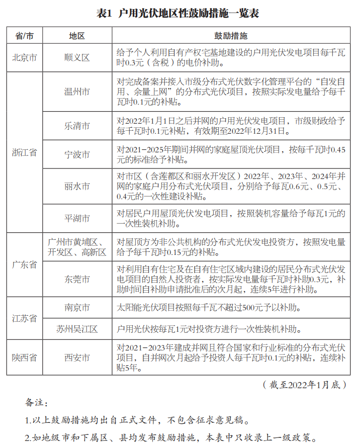 当前,我国户用光伏已从补贴驱动走向平价上网,行业发展迈向独立成长阶段,长期前景仍被市场看好。一方面,相较海外市场,当前我国户用光伏的市场渗透率相对较低,伴随整县(市、区)屋顶分布式光伏开发试点工作的推进,有望在全国开启一个万亿级新增市场,支撑行业实现发展新跃升。地区性政策的鼓励,也促进了户用光伏行业的发展。2022年新建项目国家补贴政策还未明确,户用光伏平价上网已被业内认为是大势所趋。据不完全统计,截至1月底,已有北京、浙江、江苏等省(市)的二十多个地区提出了分布式光伏新增项目电价补贴、补助或奖励政策,部分地区还为户用光伏项目设置了专项补贴,以期吸引更多社会资本进入当地户用光伏市场。再加上持续下行的行业建设成本、丰富的农村地区屋顶资源,均将为行业后续发展持续注入动力。