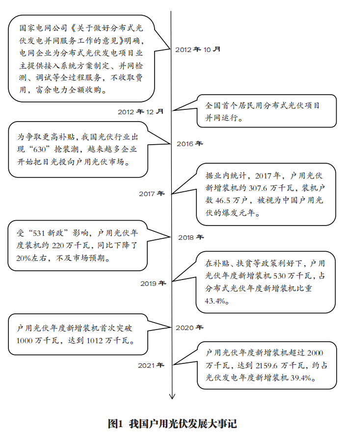 2021年,我国户用光伏年度新增装机规模首次突破2000万千瓦,达到2159.6万千瓦,约占光伏发电年度新增装机的39.4%,其发展已成为推动我国落实乡村振兴战略,如期实现碳达峰碳中和目标的重要力量。与此同时,我国屋顶分布式光伏整县推进试点工作吸引了全社会目光,在这场史无前例的分布式光伏开发热潮中,户用光伏行业将实现发展新跃升。