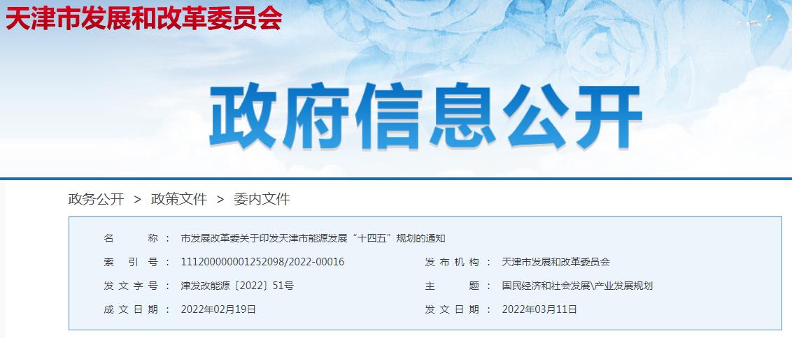 《天津市能源发展“十四五”规划》已经国家能源局批复同意,现印发给你们,请认真贯彻落实,确保完成规划目标任务。