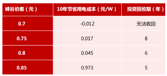 未来随储能投资成本下行,工商业经济性有望进一步凸显。预计投资成本下行至1.4、1.3、1.2元/Wh时,对应10年期度电成本分别为0.68、0.64、0.59元 /KWh,1.2元/Wh下,峰谷价差在0.6元/KWh时即可具备经济性。