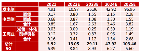 综合来看,预计2022-2025年储能新增装机量(除5G应用外)分别为13.05、29.11、47.92、103.46GWh。新增装机量的21-25年年复合增长率约104.5%。