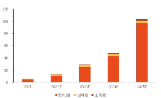 新增装机量中,以政策推动的发电侧占比最大。2022-2025年分别占总量的87.6%、89.0%、89.6%、93.7%。其次为发电侧。