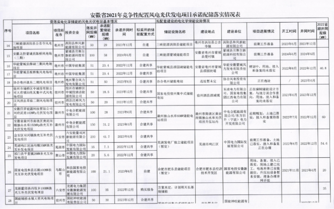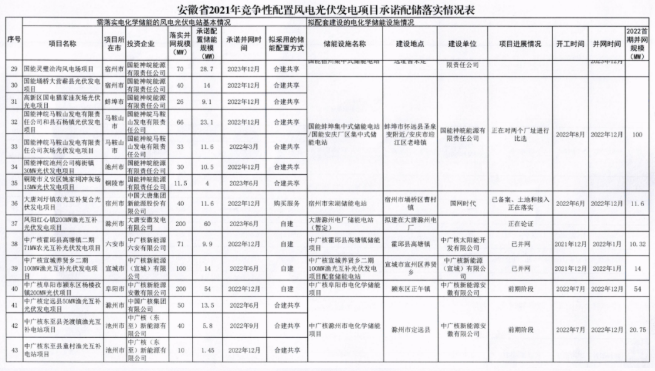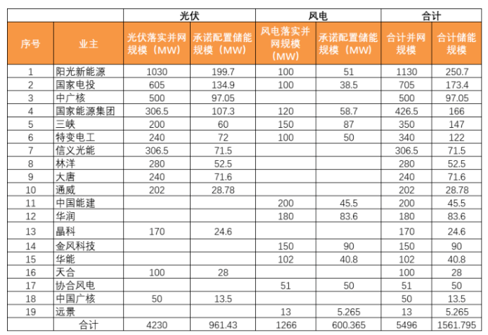 此次安徽省2021年竞争性配置风电、光伏落实并网的发电项目共有5.496GW,其中光伏4.23GW,风电1.266GW。所有项目要求配储,规模约1.56GW。根据统计的风光并网规模来看,阳光新能源以1.13GW风光,250.7MW储能位列第一,随后是国家电投705MW风光,储能173.4MW;中广核500MW风光、储能97.05MW;以及国家能源集团、三峡等紧随其后。