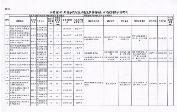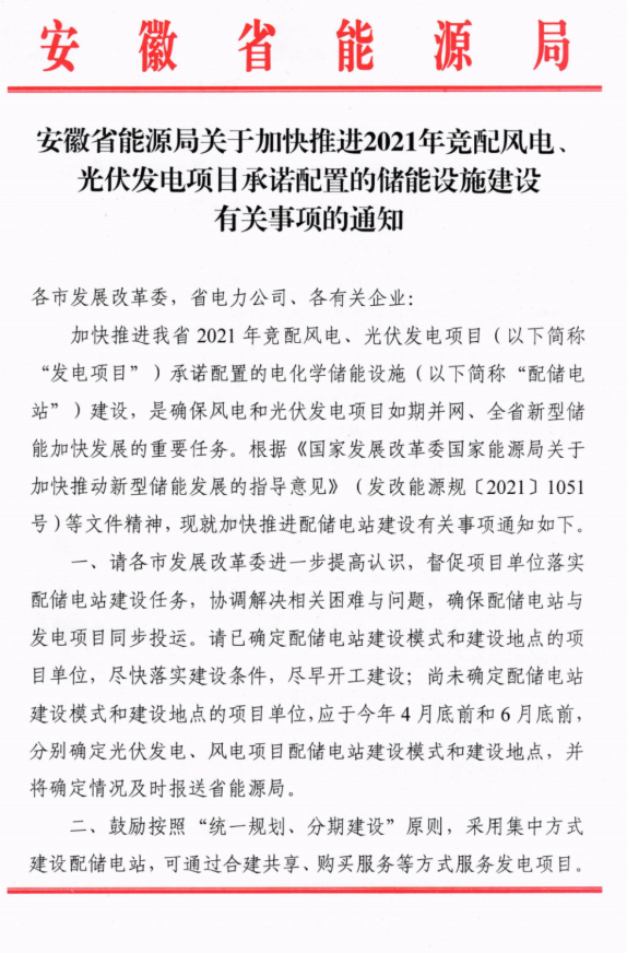 3月16日,安徽省能源局发布了《关于加快推进2021年竞配风电、光伏发电项目承诺配置的储能设施建设有关事项的通知》。