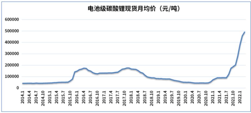 图1 2014.1-2022.1电池级碳酸锂现货月均价变化情况