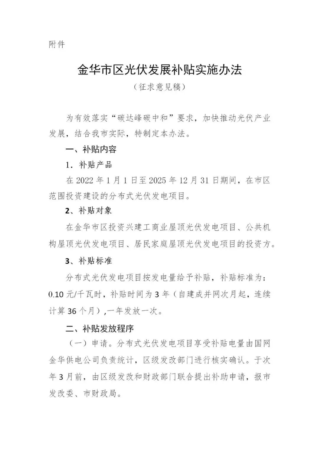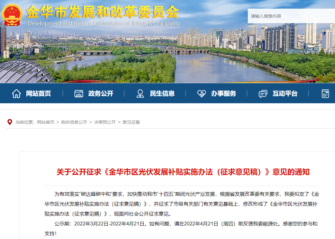 3月22日,浙江省金华市发改委发布关于公开征求《金华市区光伏发展补贴实施办法(征求意见稿)》意见的通知。