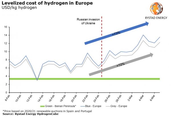 Rystad Energy的研究预测,随着蓝色和灰色氢的成本随着化石燃料价格的上涨而飙升,绿色氢作为一种负担得起且安全的可再生能源在欧洲的可行性正在增强。