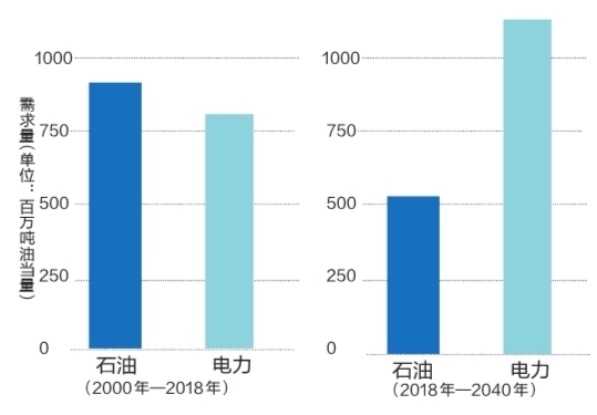 报告预测,综合多重因素,在2040年前全球能源需求将以每年1%的速度增长,远低于2018年2.3%的增长水平。由于能效更高的汽车和电动汽车的普及,全球原油需求在2030年将触顶。