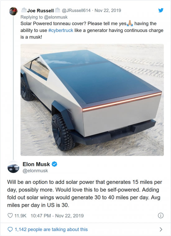 马斯克在Twitter上提到Cybertruck的太阳能充电功能时写道--“希望它能自动充电。”另外他还补充称,美国汽车通常每天行驶的里程数在30英里左右。