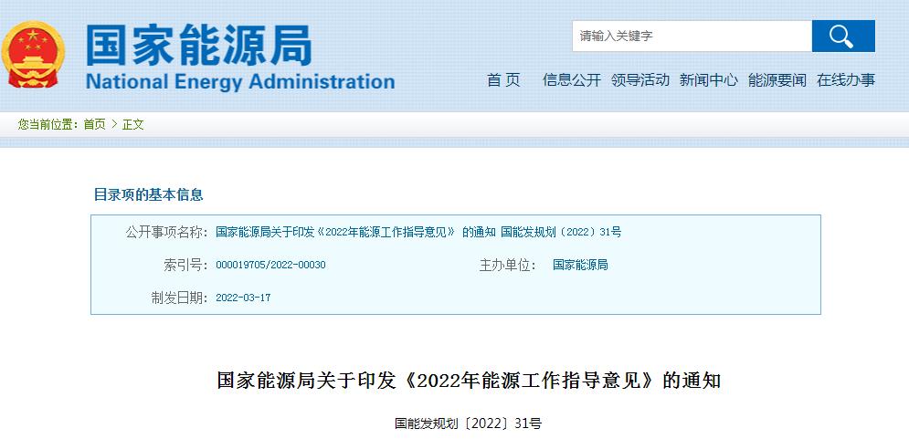 为深入贯彻落实党中央、国务院有关决策部署,扎实做好2022年能源工作,持续推动能源高质量发展,国家能源局研究制定了《2022年能源工作指导意见》,现予发布,请结合各地、各单位实际情况,抓好落实,并将执行情况于2022年12月底前函告我局。