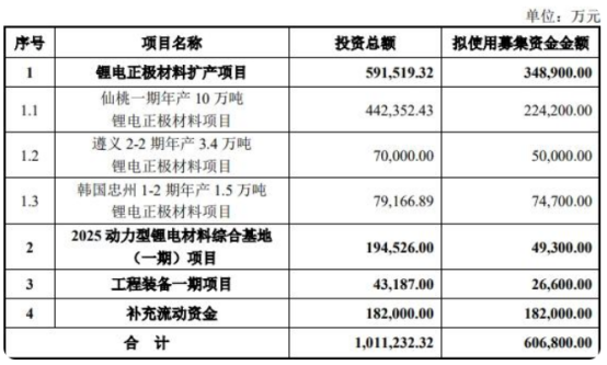 本次募集资金总额不超60.68亿元,扩产项目包括仙桃一期年产10万吨锂电正极材料项目、遵义2-2期年产3.4万吨锂电正极材料项目、韩国忠州1-2期年产1.5万吨锂电正极材料项目。