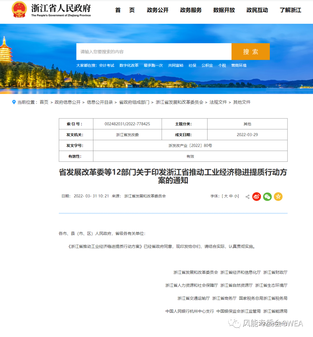 3月31日,浙江省发改委等12部门联合印发《浙江省推动工业经济稳进提质行动方案》(浙发改产业〔2022〕80号)。方案提出要大力发展新能源产业,出台海上风电发展支持政策,大力推进“风光倍增工程”,2022年开工100万千瓦、并网60万千瓦。